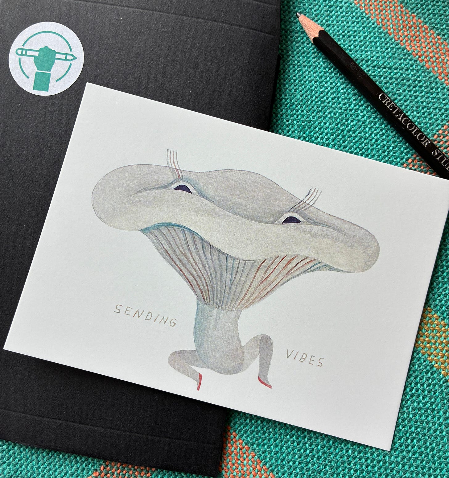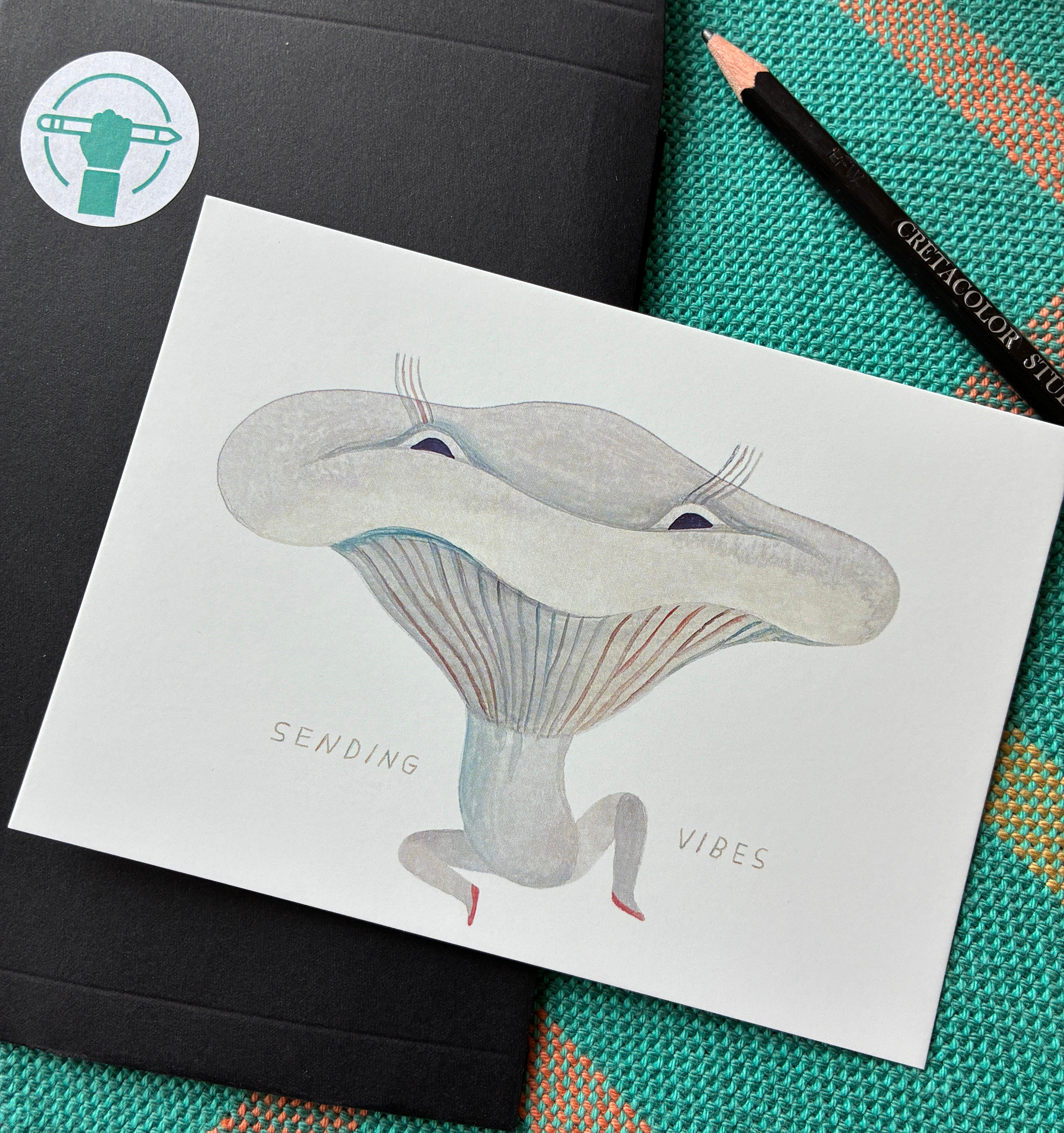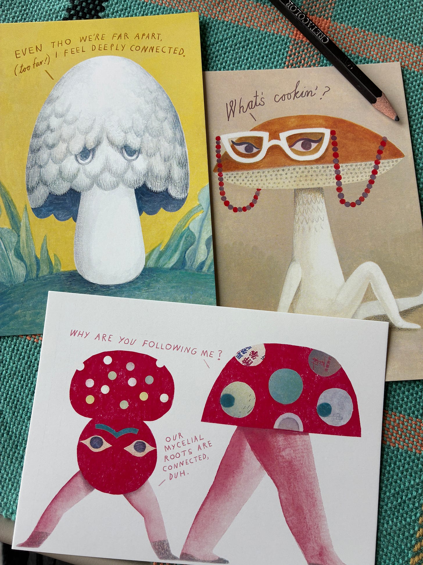 I’ve been noodling around with these Existentialist Mushroom Comics for the past 3 years, evolving slower than mycelial tendrils yet with no lapse in enthusiasm. While I haven’t been able to connect the dots of dialogue into sensible comic strips (YET), I leapt at the chance to turn scenes into postcards, with The Pound Project.