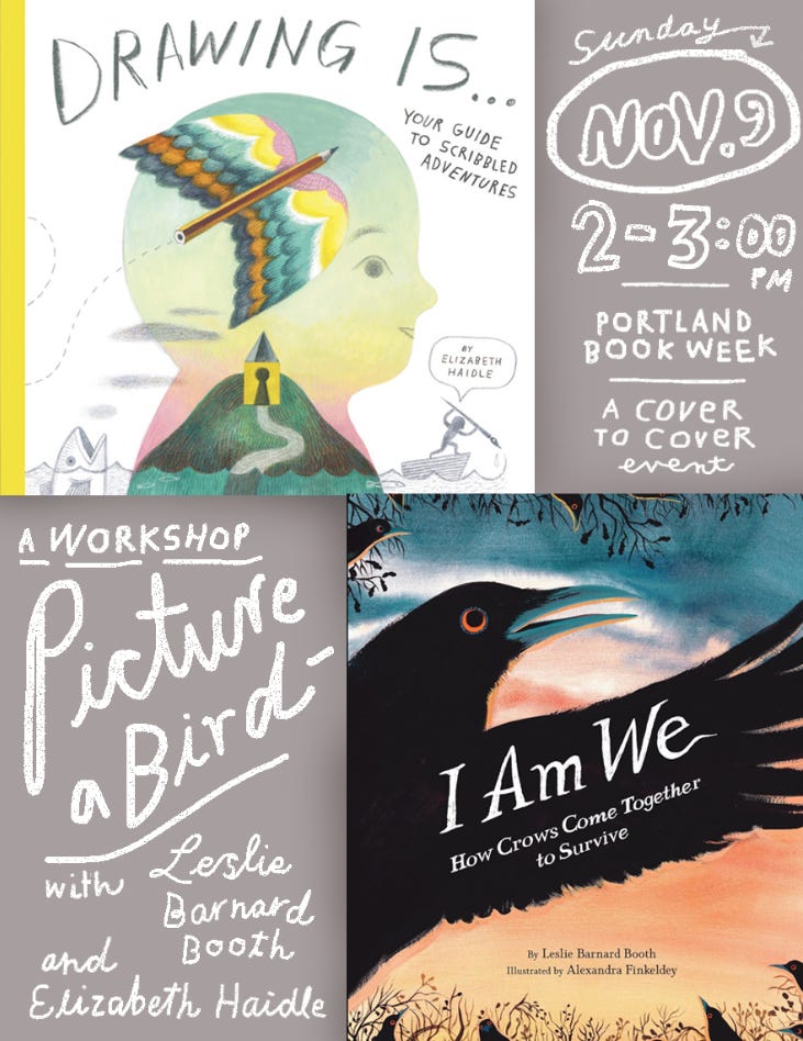 Next Sunday, at A Children’s Place, part of the Portland Book Fest Cover-to-Cover series, I’ll be co-hosting a workshop with my friend Leslie Barnard Booth, who wrote I AM WE: HOW CROWS STICK TOGETHER, I’ll be co hosting a workshop with tips from my DRAWING IS…. book.