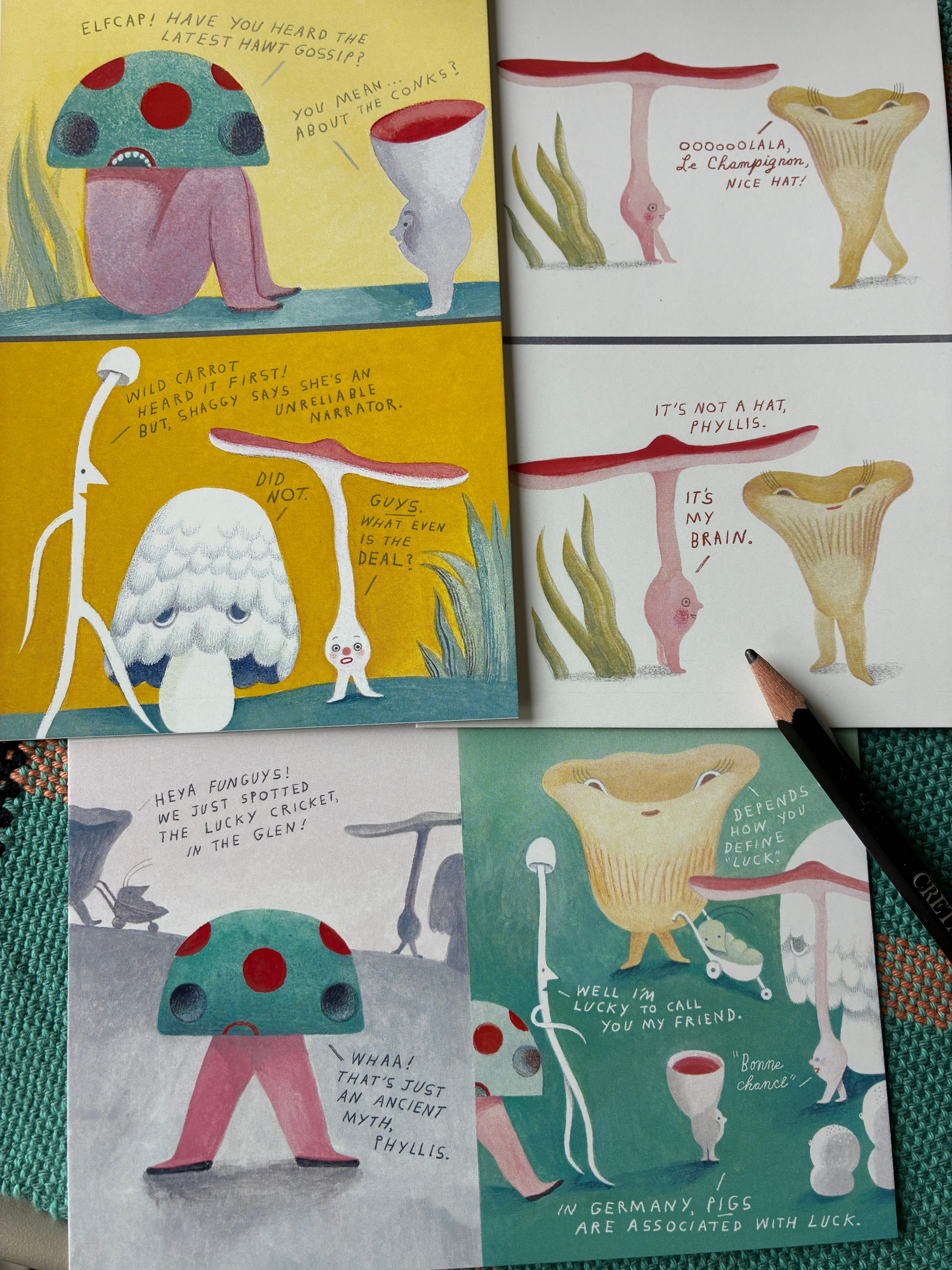 Of course I had to include Blue Oyster, (a favorite in my kitchen frying pan). Then there’s Nita & Nub—a sentient amanita with younger fungal fruit in tow. Of course Shaggy Ink Cap (whose ink you can really paint with). Elfcap, Blewit, Enoki—all such excellent botanical names—I didn’t need to add anything, except eyes, to have a cast of compelling characters.